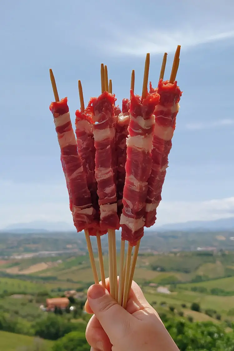 Le 'rustelle' nascono dalla pastorizia stazionaria abruzzese. All'inizio rappresentava un modo per non sprecare la carne da parte dei pastori, successivamente però, visto il grande successo, si è iniziati ad utilizzare tagli più pregiati. Ad oggi sono diffusi anche nelle varianti di fegato e ventricina.