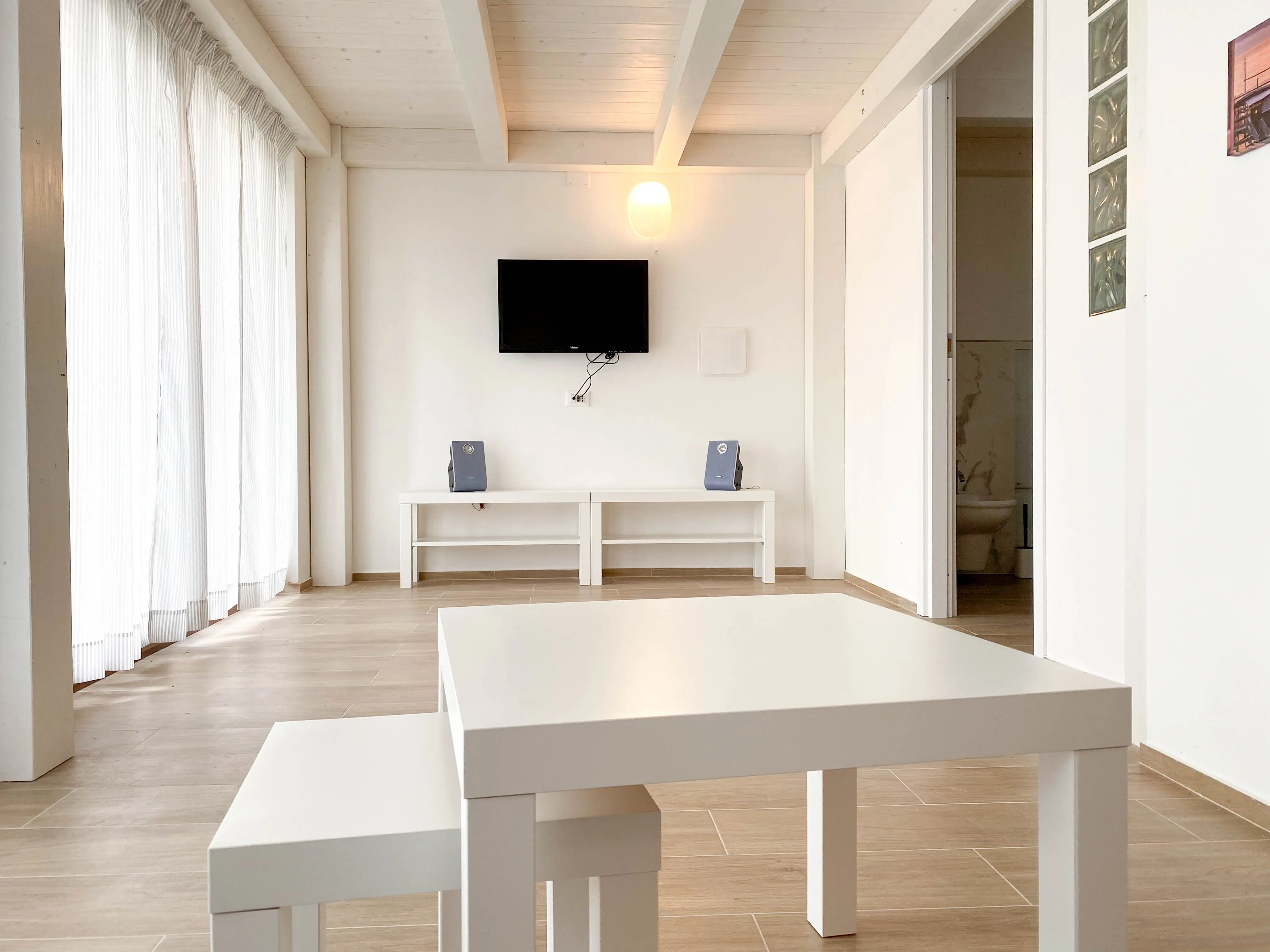 Nella zona living, troverete un confortevole divano e una TV a schermo piatto, perfetta per rilassarsi e godersi un film dopo una lunga giornata di visite turistiche.