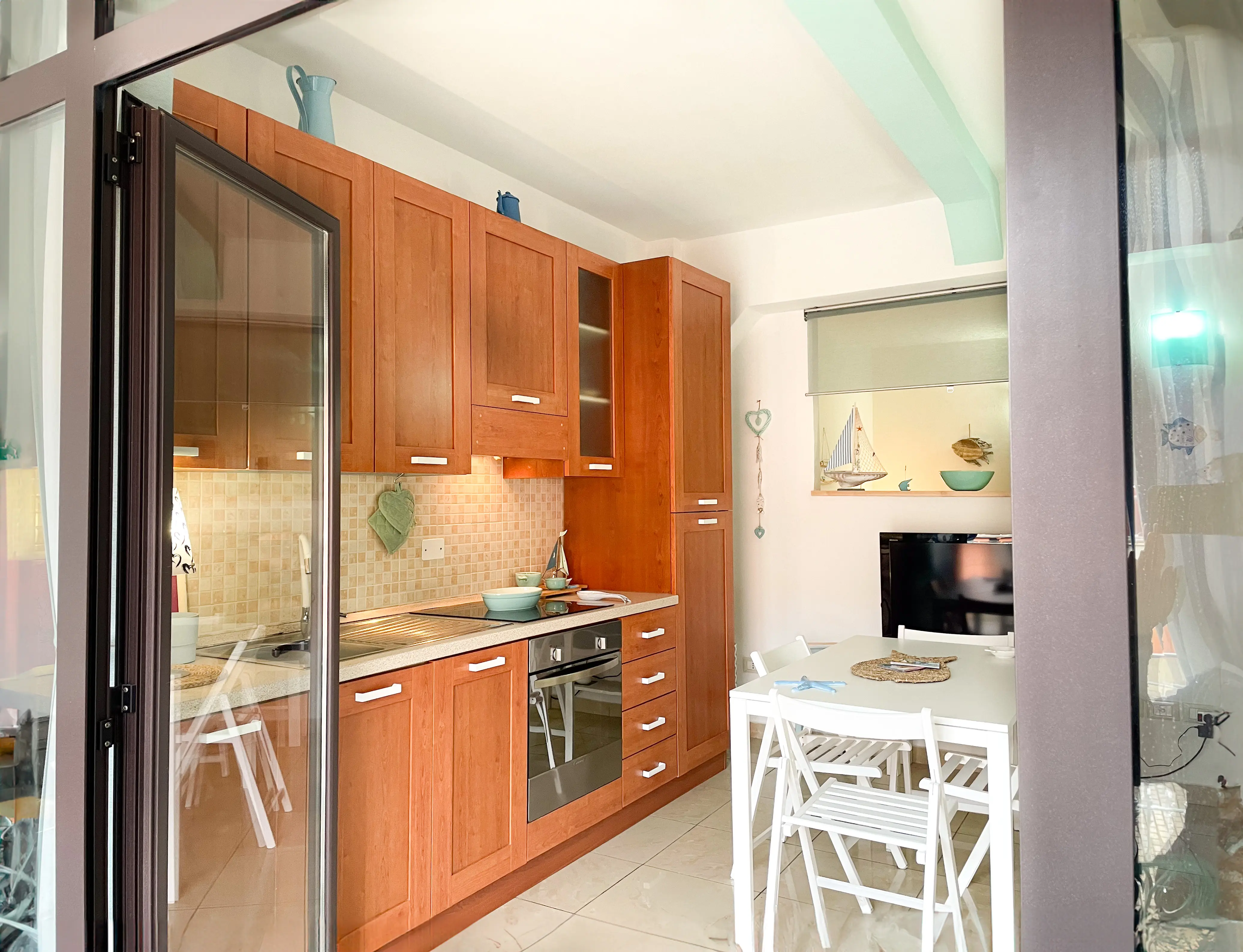Dalla sala, potrete accedere a un grazioso terrazzino coperto, il luogo ideale per iniziare la giornata con una colazione al fresco. Ammirate uno scorcio del mare che si perde all'orizzonte, regalando un'atmosfera rilassante e suggestiva.