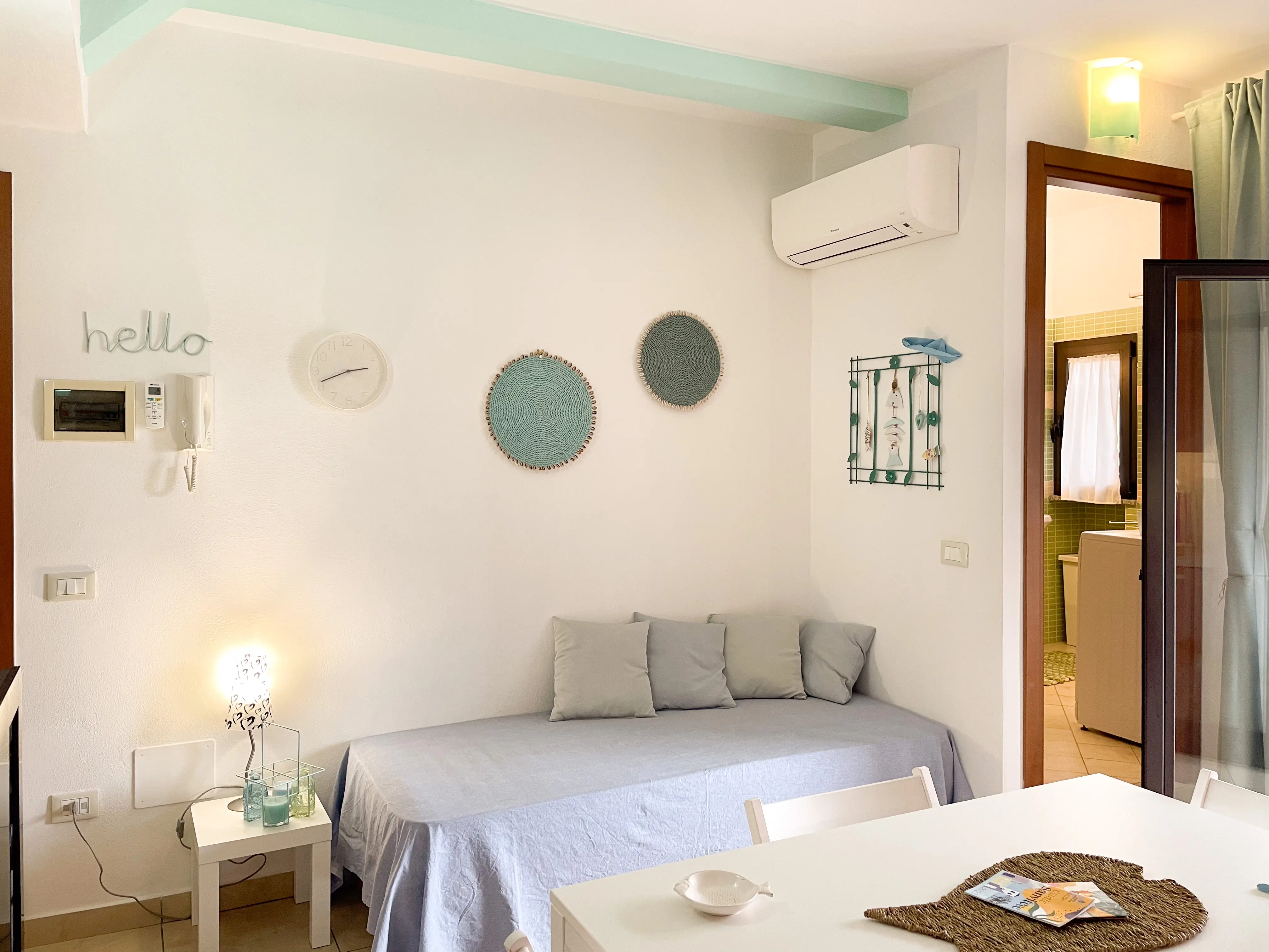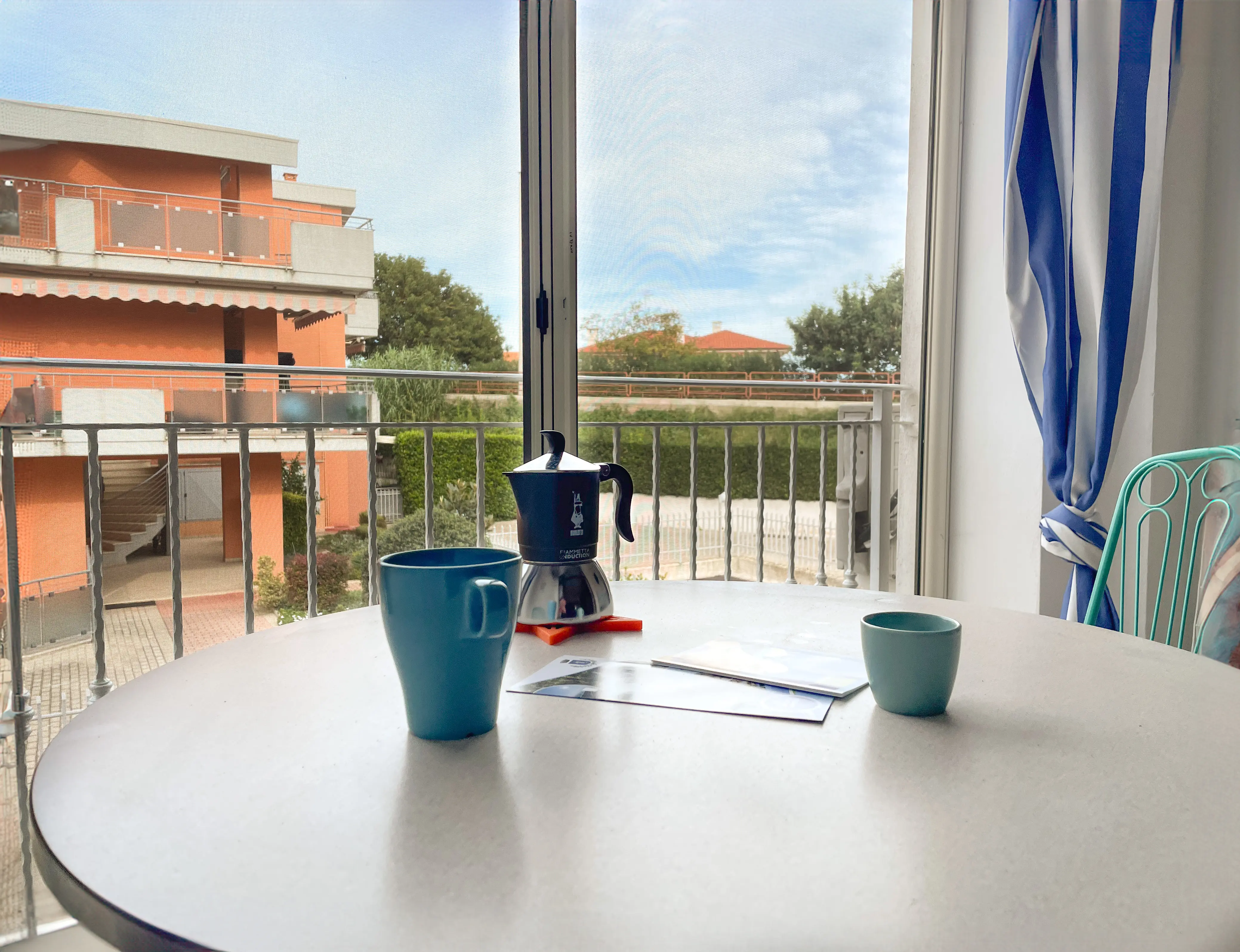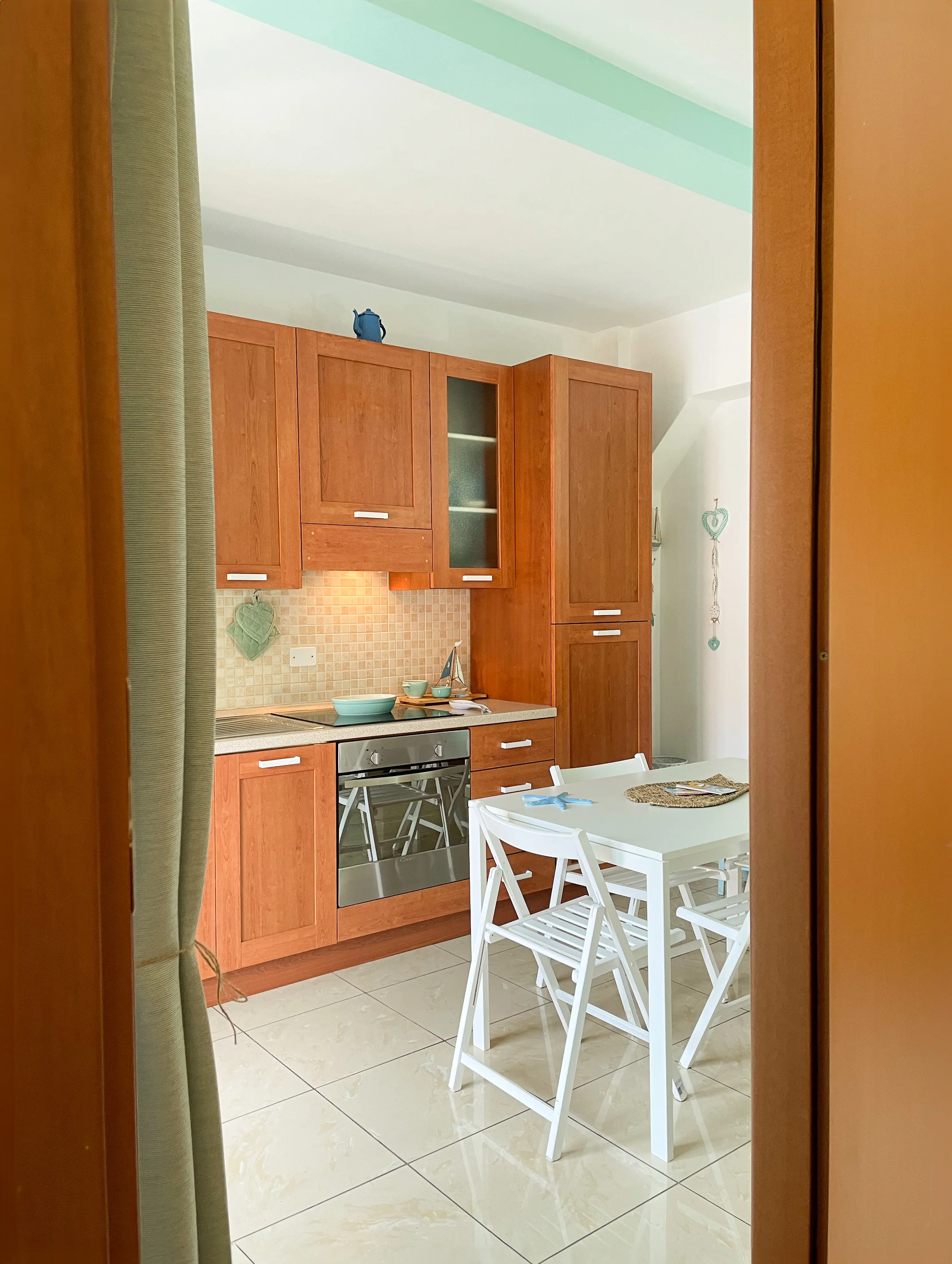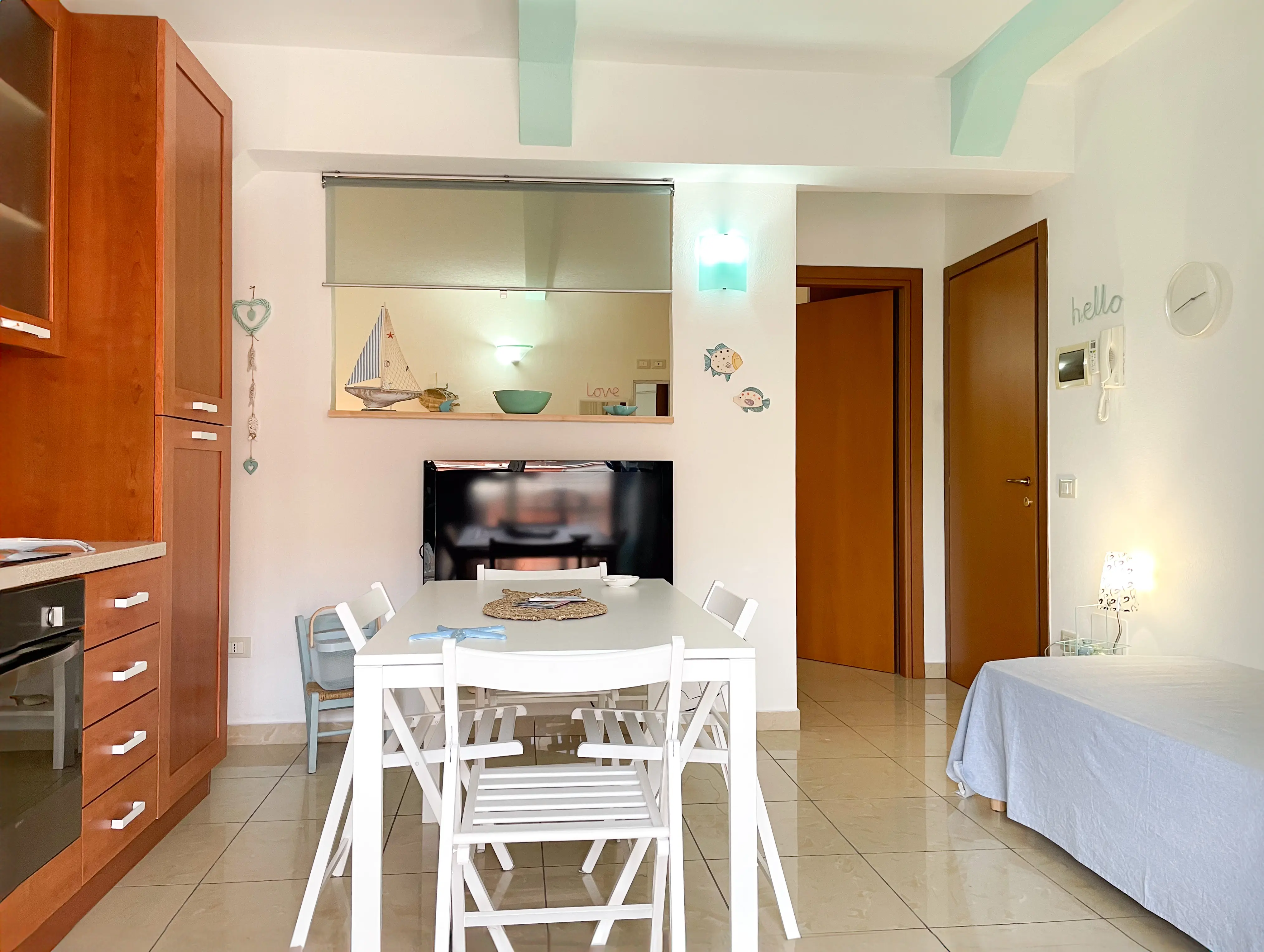 Dalla sala, potrete accedere a un grazioso terrazzino coperto, il luogo ideale per iniziare la giornata con una colazione al fresco. Ammirate uno scorcio del mare che si perde all'orizzonte, regalando un'atmosfera rilassante e suggestiva.