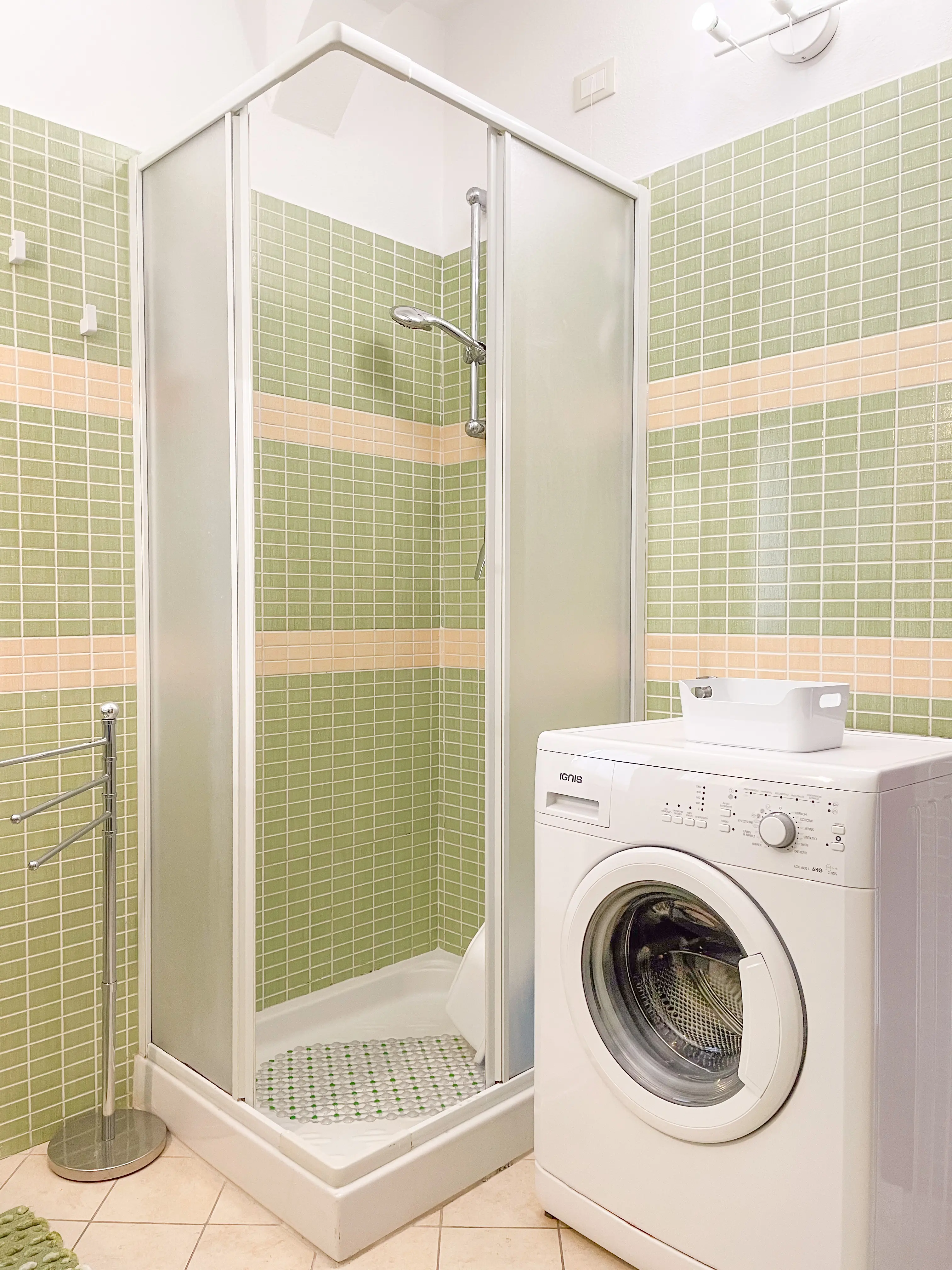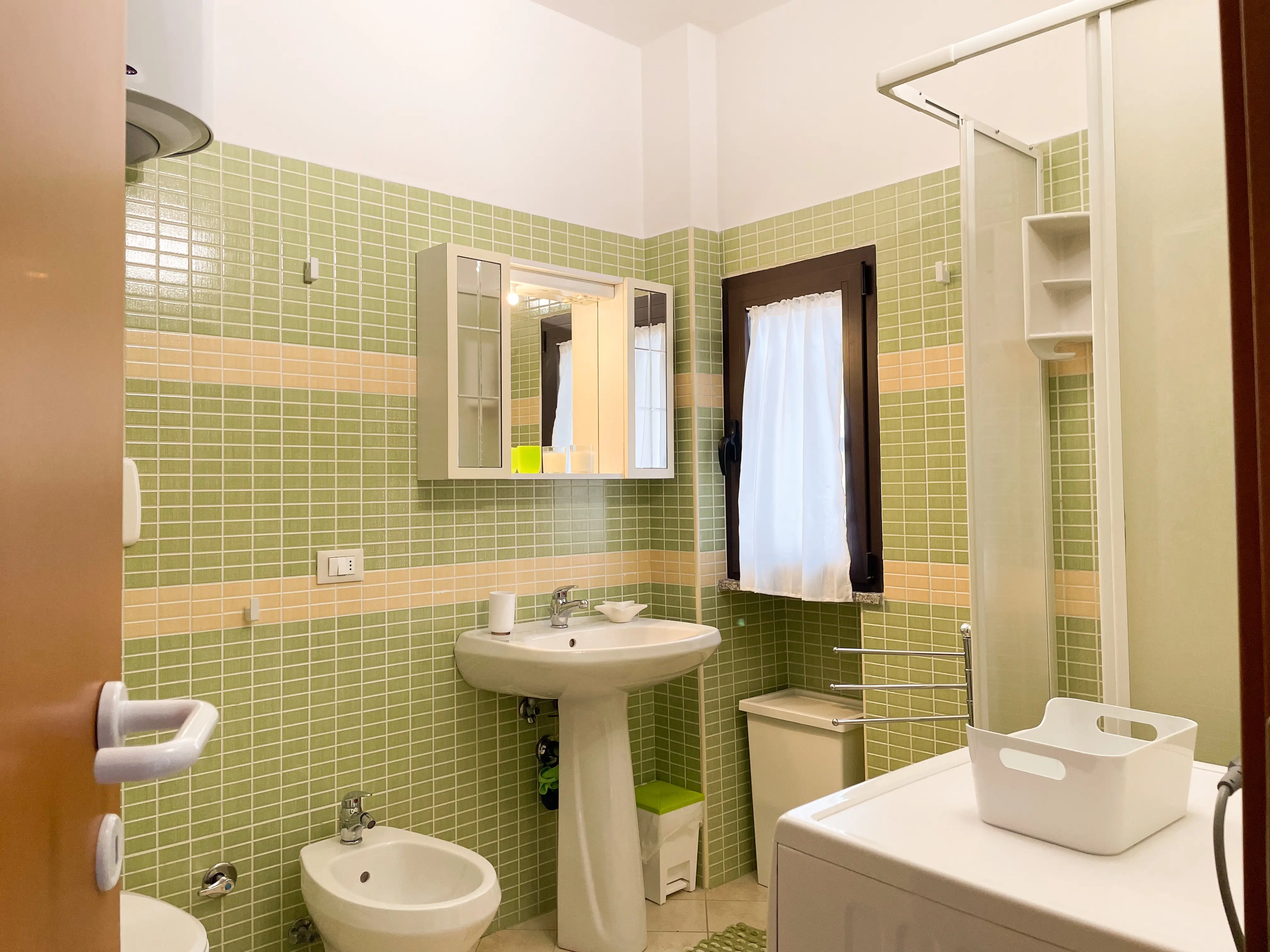 La disposizione comprende una camera da letto accogliente con un letto matrimoniale e uno singolo, mentre nella sala principale troverete una cucina completamente attrezzata, un tavolo da pranzo e un comodo divano-letto singolo. Il bagno, completo di doccia, bidet, wc, lavandino e lavatrice, offre comfort e praticità.